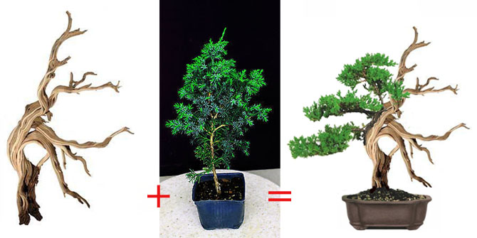 Para realizar este trabalho deveremos retirar a casca da árvore no ponto onde esta irá ficar em contacto com a madeira morta e prendemos a árvore a essa madeira com pequenos pregos de latão (não criam oxidação, não serão visíveis). Ainda pode ser efetuada uma "cama" para o tronco vivo, escavando ligeiramente a madeira morta e embutindo aí a árvore para lhe dar um efeito mais real.