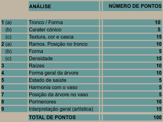 Já estamos a correr depressa demais, mas na minha opinião as árvores deverão estar sempre prontas para uma exposição, isso quer dizer que estarão sempre em bom estado e apresentáveis, mesmo sem ir a concurso. Na tabela abaixo fica a pontuação dos elementos que o júri pontuará, estes são os mais importantes, seria bom que os pudéssemos manter sempre dentro desta pontuação, ou tentando atingi-la, assim sendo, teremos sempre um excelente bonsai.
