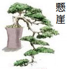 O tronco recai sobre o rebordo do vaso e imita uma árvore que pende de uma falésia. A parte inferior deste Bonsai deve ficar num plano mais baixo que o vaso. Outra variante deste estilo é a Meia Cascata - Han Kengai, tal como poderemos ver esse pinheiro no fundo desta página.